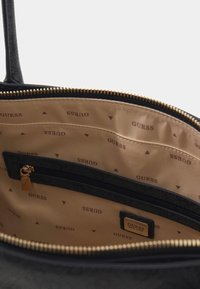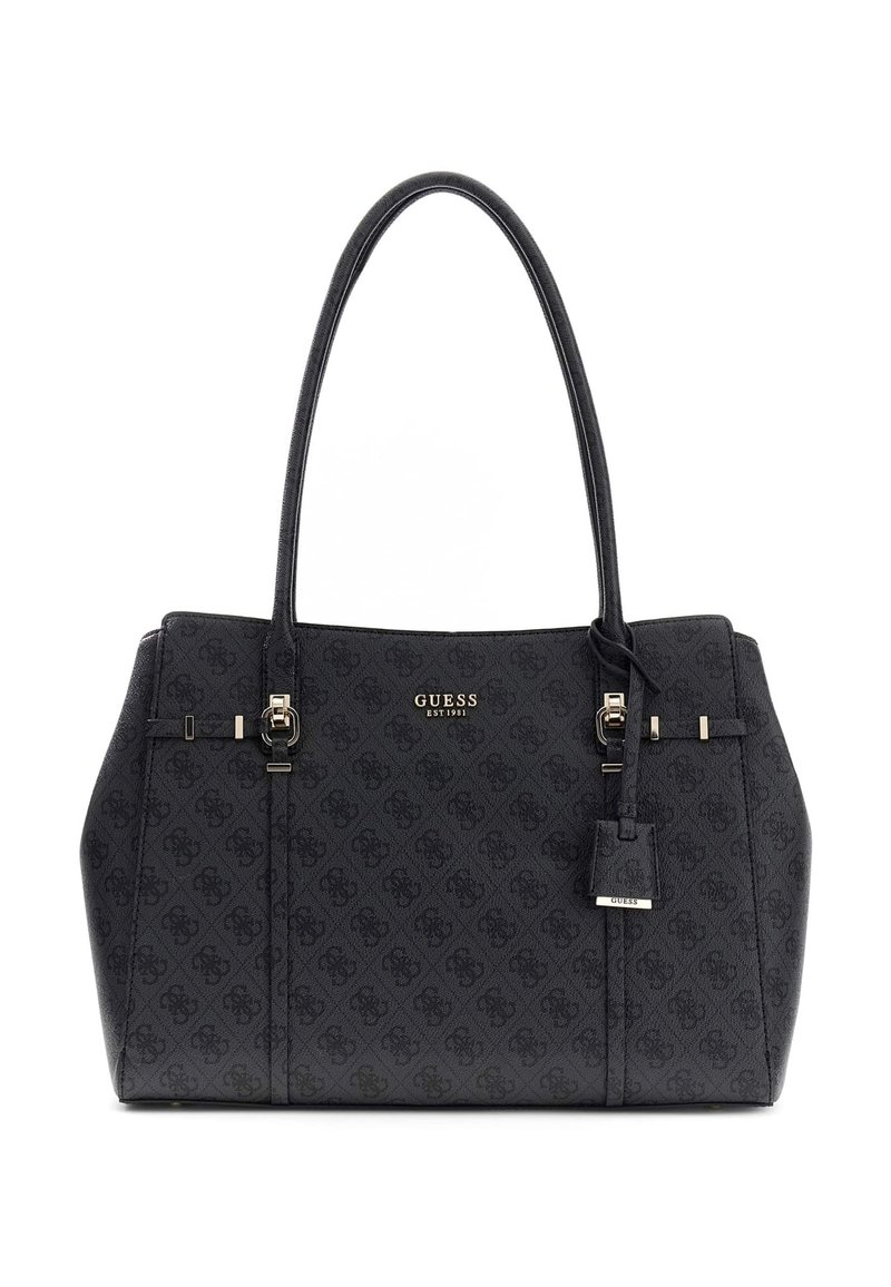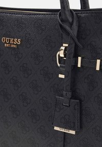 Sac à main noir Guess avec double poignée, plaque logo ton or, motif subtil et petite étiquette suspendue sur fond blanc.