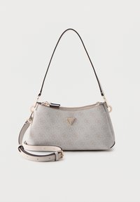 Sac à main en tissu gris avec motif logo, forme incurvée, fermeture éclair et bandoulière ajustable. Ferrures dorées aux extrémités.