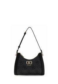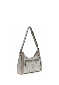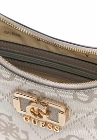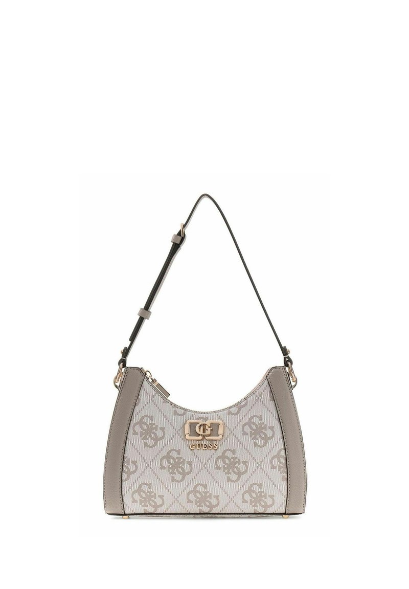 Sac à main Guess gris et beige avec motif logo, garnitures dorées et bandoulière noire réglable.