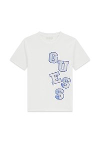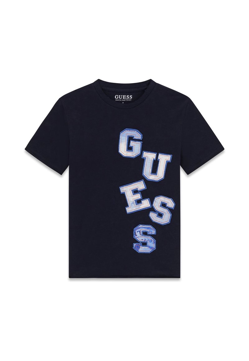 T-shirt noir à manches courtes avec de grandes lettres bleues et blanches formant le mot "GUESS" disposées verticalement sur un côté.