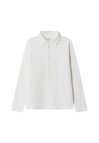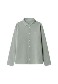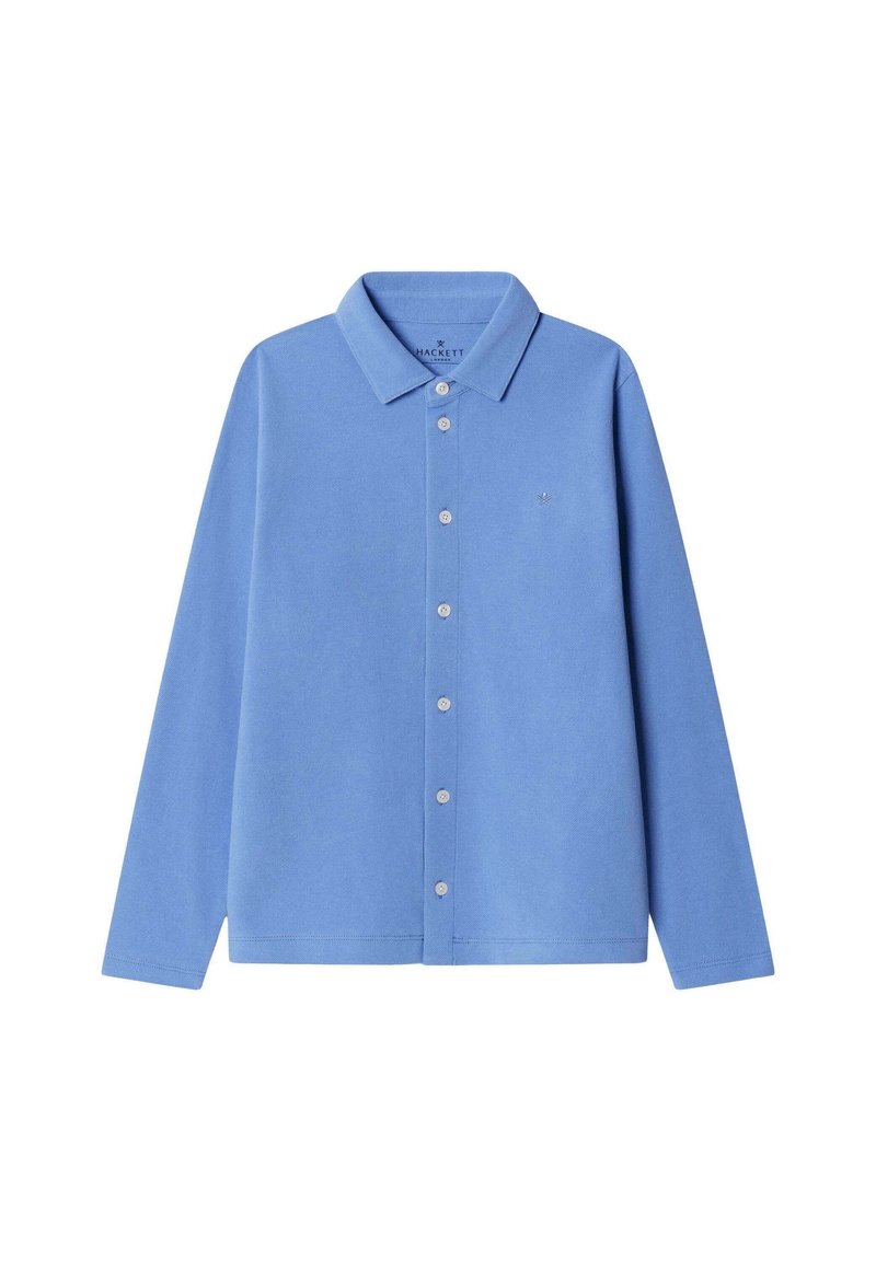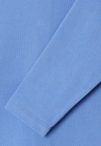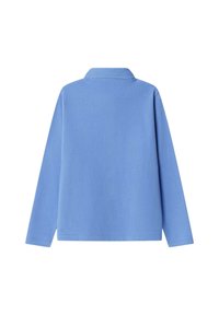 Polo à manches longues, bleu clair, en tissu doux, avec une patte de boutonnage, un col pointu et un petit logo sur la poitrine.