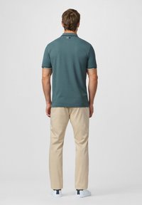 Homme portant un polo à manches courtes bleu sarcelle avec un col et un pantalon beige, debout devant un fond clair uni.