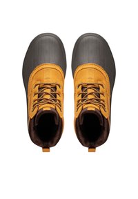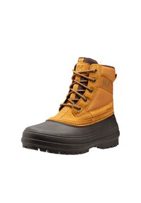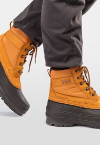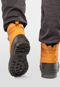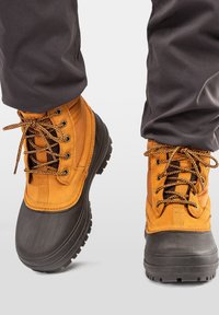 Personne portant des bottes d'hiver imperméables marron et noires avec des semelles épaisses et un pantalon noir.