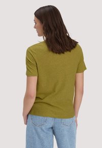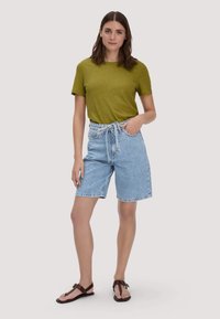 Femme aux cheveux bruns mi-longs portant un t-shirt kaki à manches courtes rentré dans un jean bleu clair taille haute avec une ceinture en tissu.