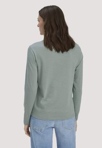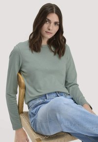 Jeune femme aux cheveux bruns ondulés portant une chemise verte sauge à manches longues et un jean bleu clair, debout devant un fond uni.