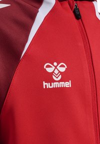 Veste de sport zippée rouge et bordeaux avec des bandes blanches sur les épaules et les côtés, arborant le logo hummel sur la poitrine gauche.