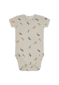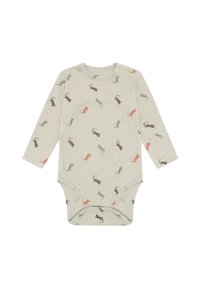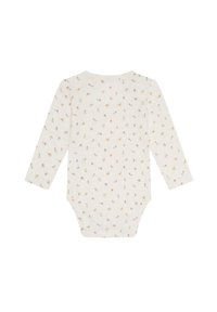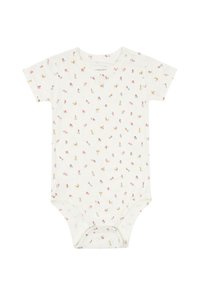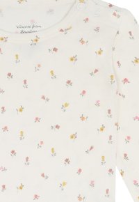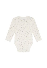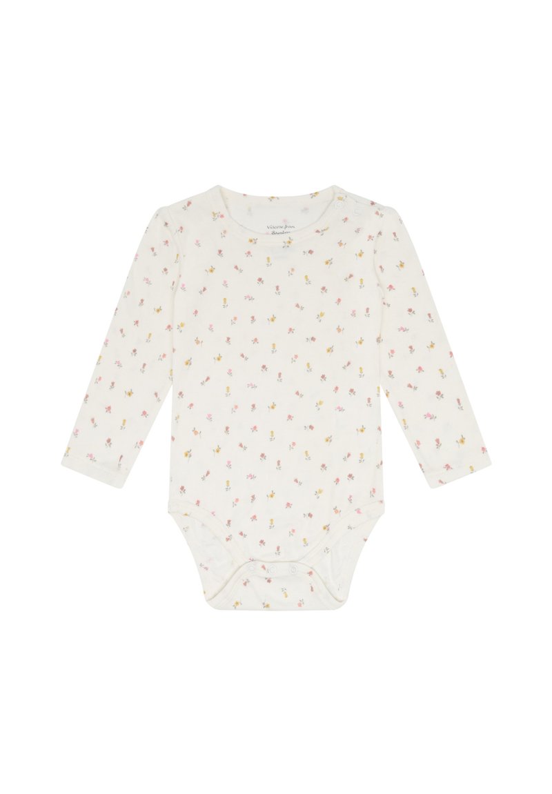 Body blanc à manches longues pour bébé avec un petit motif floral rose, jaune et orange, boutons-pression à l'épaule et à l'entrejambe.