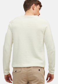 Homme debout portant un pull en tricot bleu clair, un pantalon ample gris foncé, des chaussures habillées noires et une seule boucle d'oreille à l'oreille gauche.