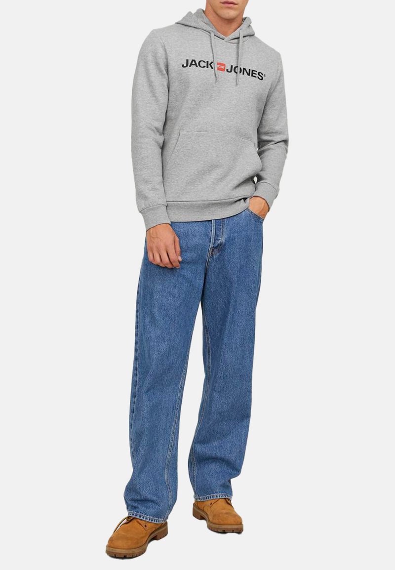 Homme portant un sweat à capuche gris Jack & Jones, un jean bleu ample et des chaussures marron, debout avec une main dans la poche.