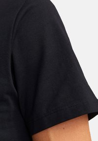Homme aux cheveux coupés courts, portant un t-shirt noir uni à manches courtes, de dos, montrant des tatouages sur son bras gauche sur un fond blanc.