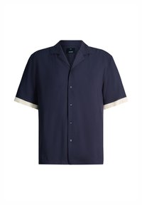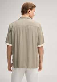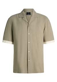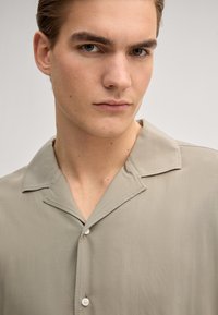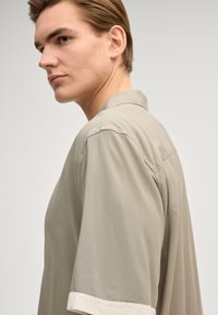 Homme portant une chemise beige à manches courtes avec des bordures blanches aux manches et un pantalon blanc, debout devant un fond clair uni.
