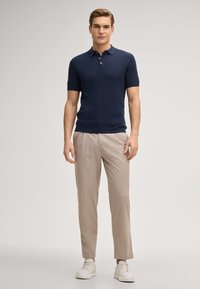 Jeune homme portant un polo à manches courtes texturé bleu marine et un pantalon beige, sur un fond clair uni.