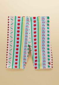 Deux paires de shorts mi-genoux : une jaune unie, une blanche à rayures verticales avec des pommes, des cerises, des fleurs et des poires.