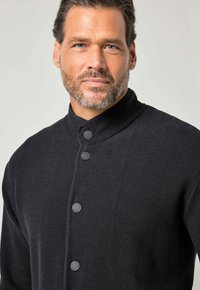 Cardigan en maille noire avec col montant, doté d'une fermeture à boutons et d'une poche latérale. Tissu texturé avec bordures contrastantes.