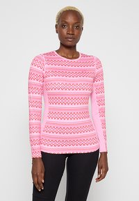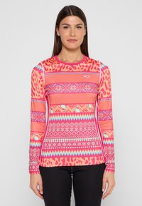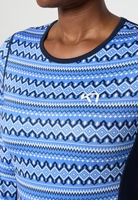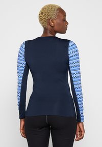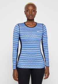 Femme portant un haut bleu ajusté à manches longues avec des motifs géométriques et des panneaux latéraux noirs, debout devant un fond uni.