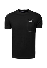 Jeune homme aux bras tatoués portant un t-shirt blanc Karl Lagerfeld avec une petite poche et un graphisme noir au-dessus.