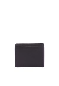 Portefeuille bifold en cuir noir avec une couture incurvée subtile et une petite plaque métallique Lancetti dans le coin inférieur droit.