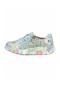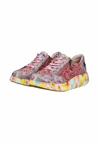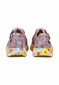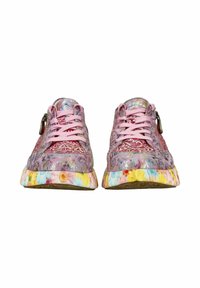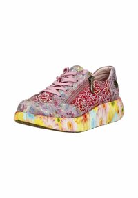 Baskets à motif floral rose avec fermeture éclair latérale, semelle imprimée de fleurs colorées et laçage.