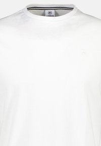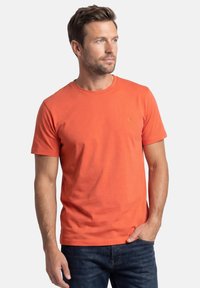 Homme debout portant un t-shirt orange à manches courtes, un jean bleu foncé et des baskets blanches, devant un fond clair uni.