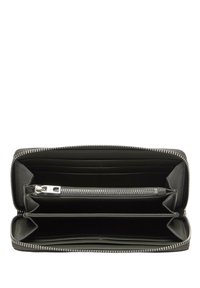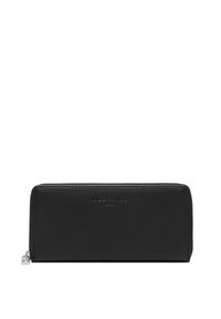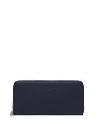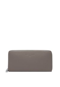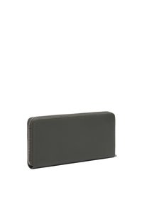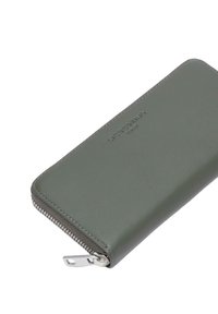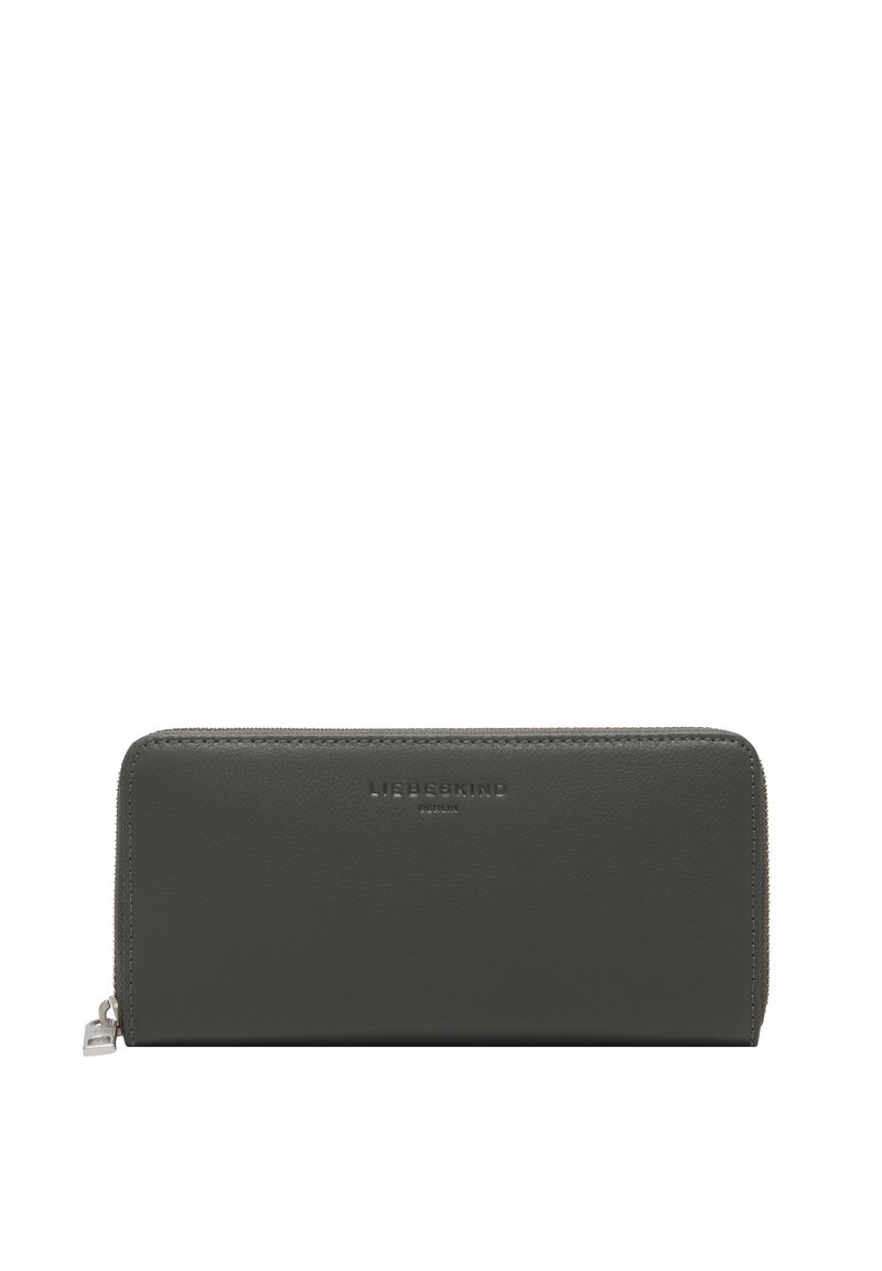 Portefeuille rectangulaire en cuir vert foncé avec fermeture éclair tout autour et logo embossé "Liebeskind Berlin" sur le devant.