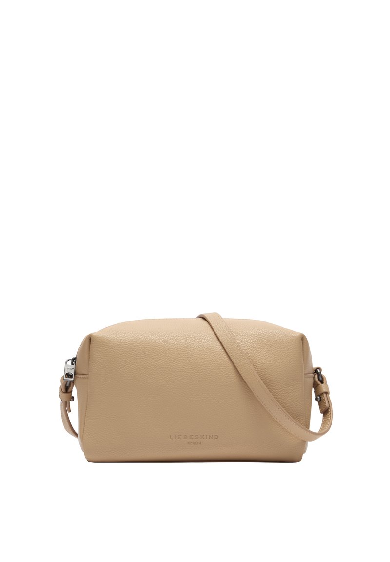 Sac bandoulière en cuir beige avec sangle ajustable et boucle en argent, avec le nom de la marque "Liebeskind Berlin" discrètement embossé.