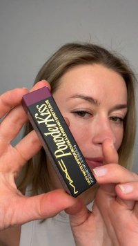 Rouge à lèvres MAC dans un étui mat noir, présentant un raisin pointu couleur prune profonde avec un logo embossé. Couvercle amovible pour un accès facilité.