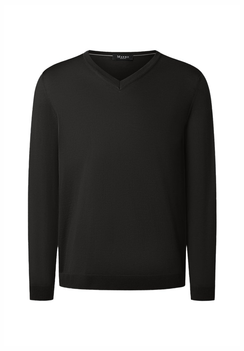 Pull noir à manches longues avec col en V, poignets et ourlet côtelés, étiquette "Maerz" à l'intérieur du col.