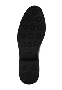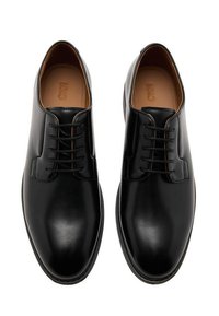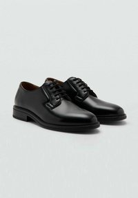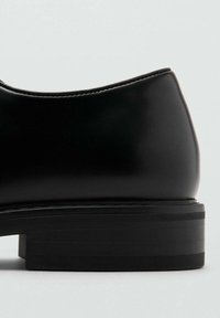 Chaussure habillée pour homme en cuir noir avec laçage fermé, petit talon empilé et bout lisse arrondi, vue de profil droit.