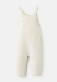 Combinaison beige tricotée avec bretelles larges, boutons en bois, une poche frontale et des fermetures à boutons aux jambes pour faciliter l'habillage.