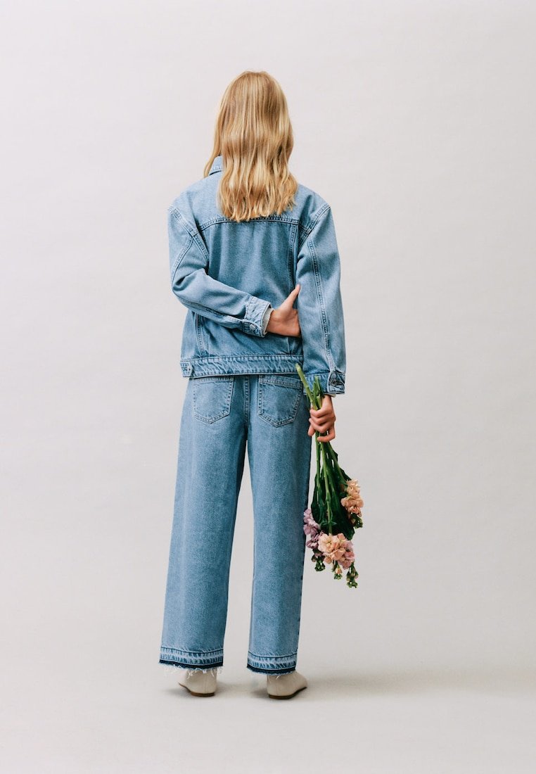 Personne aux longs cheveux blonds portant une veste en jean et un jean, vue de dos, tenant un petit bouquet de fleurs roses et violettes.