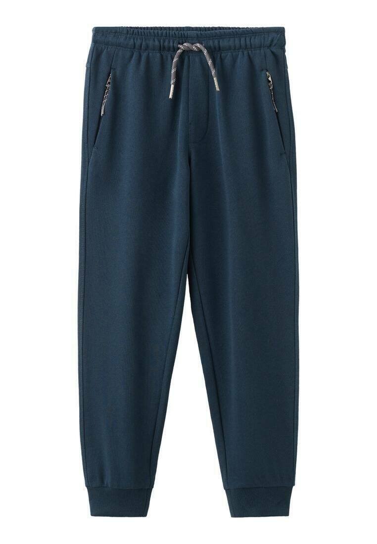 Pantalon de jogging bleu marine en tissu doux. Il possède une ceinture élastique avec cordon de serrage et deux poches latérales zippées. Bords-côtes aux chevilles.