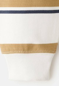 Sweat-shirt à manches longues beige et blanc à rayures avec de fines rayures noires et des poignets et un col côtelés blancs.
