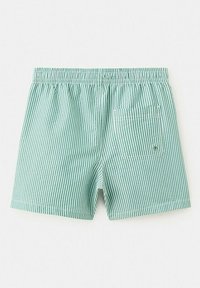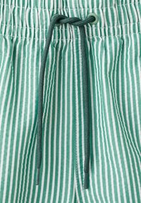Shorts à rayures verticales vert clair et blanches avec ceinture élastique et cordon vert noué en un nœud à l'avant au centre.
