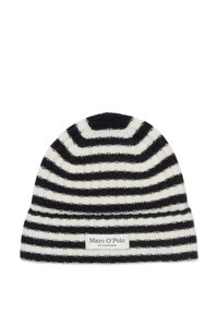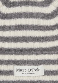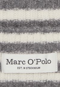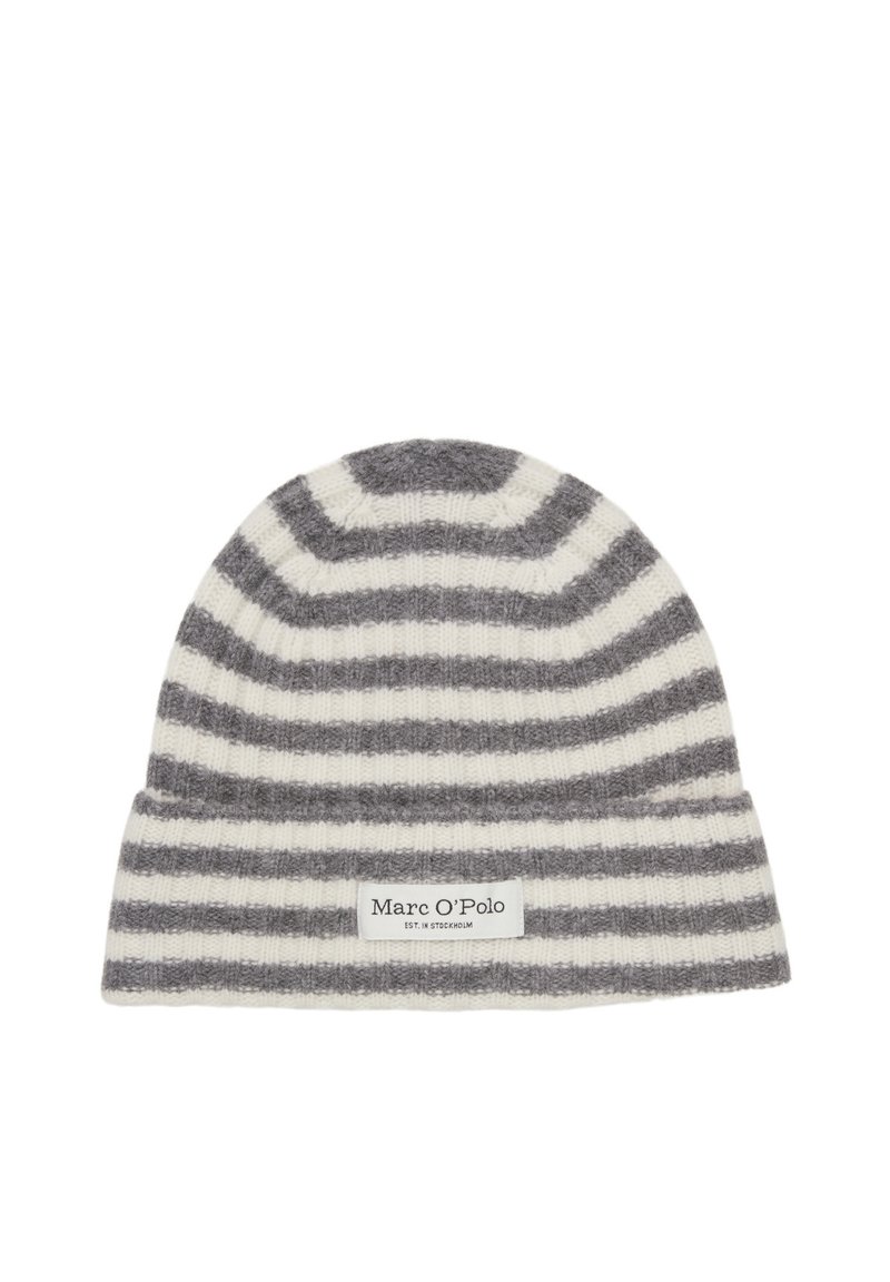 Bonnet en tricot gris et blanc à rayures, fabriqué en matériau doux, avec un revers et une étiquette portant la marque "Marc O'Polo".