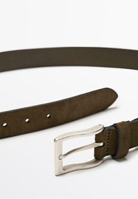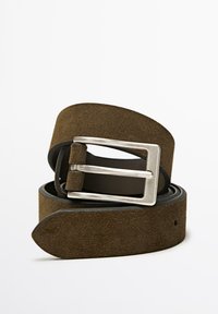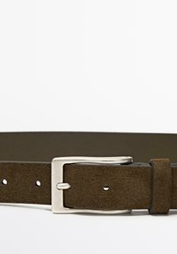 Ceinture en cuir suédé brun foncé avec une boucle rectangulaire en argent et trois trous de réglage sur fond blanc uni.