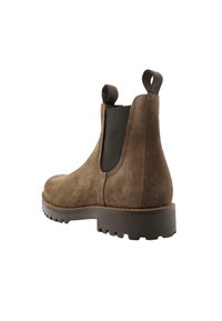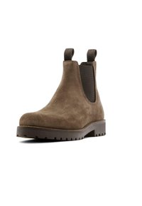 Botte Chelsea en daim brun avec panneaux élastiques noirs sur les côtés, boucles de traction à la cheville et semelle épaisse à rainures.