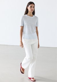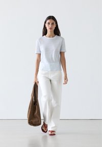 Femme portant un t-shirt gris clair, un pantalon blanc, des tongs rouges, tenant un grand sac fourre-tout marron, se tenant contre un mur blanc uni.
