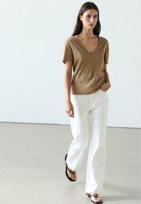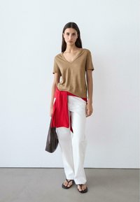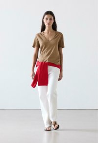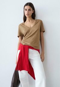 Femme aux longs cheveux bruns portant un t-shirt marron à manches courtes et col en V, ainsi qu'un pantalon blanc, debout avec une main dans la poche, sur un fond uni.