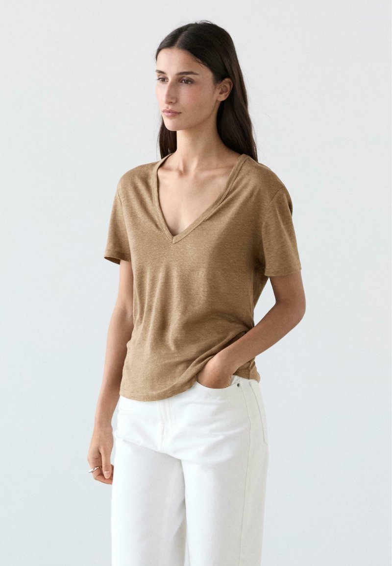 T-shirt made of linen fabric. Manches courtes. Col en V .