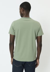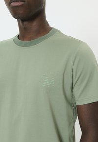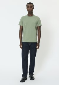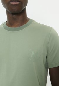T-shirt en coton vert avec un col rond, des manches courtes et un imprimé discret sur le côté gauche de la poitrine. Associé à un jean bleu foncé.