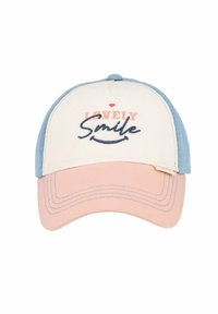 Casquette de baseball pour enfants avec une visière rose, un panneau avant blanc, des panneaux arrière bleus, et le texte "Lovely Smile" brodé avec un petit cœur rouge.