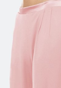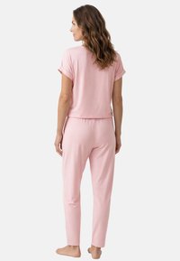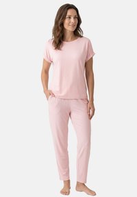 Femme debout pieds nus portant un haut à manches courtes rose clair et un pantalon assorti, les mains dans les poches, regardant légèrement sur le côté avec un sourire.