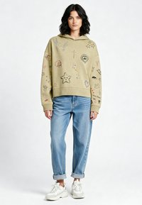 Femme portant un sweat à capuche beige orné de plusieurs broderies, comprenant des étoiles, des oiseaux, un cœur avec un œil, un crâne et du texte, associée à un jean bleu.