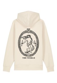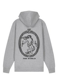 Hoodie bleu ciel avec un imprimé graphique noir représentant une figure encadrée dans un cercle orné, avec le texte "XXI" et "LE MONDE" en dessous.
