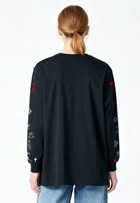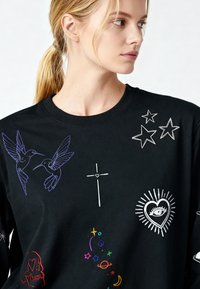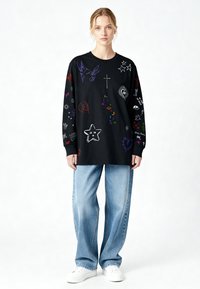 Jeune femme portant un sweat-shirt noir oversize avec des symboles colorés brodés, notamment des étoiles, des oiseaux, des cœurs, un crâne et du texte, associée à un jean bleu.