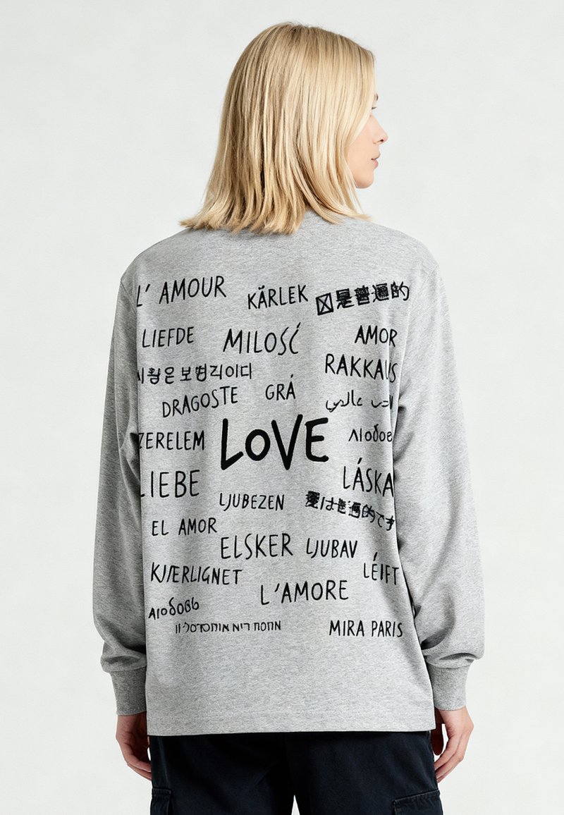 Personne blonde portant un t-shirt à manches longues gris avec le mot "amour" imprimé en diverses langues et écritures au dos.