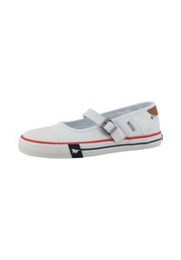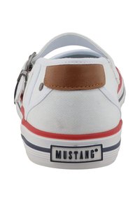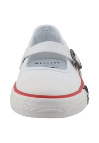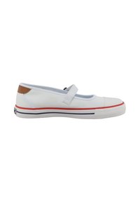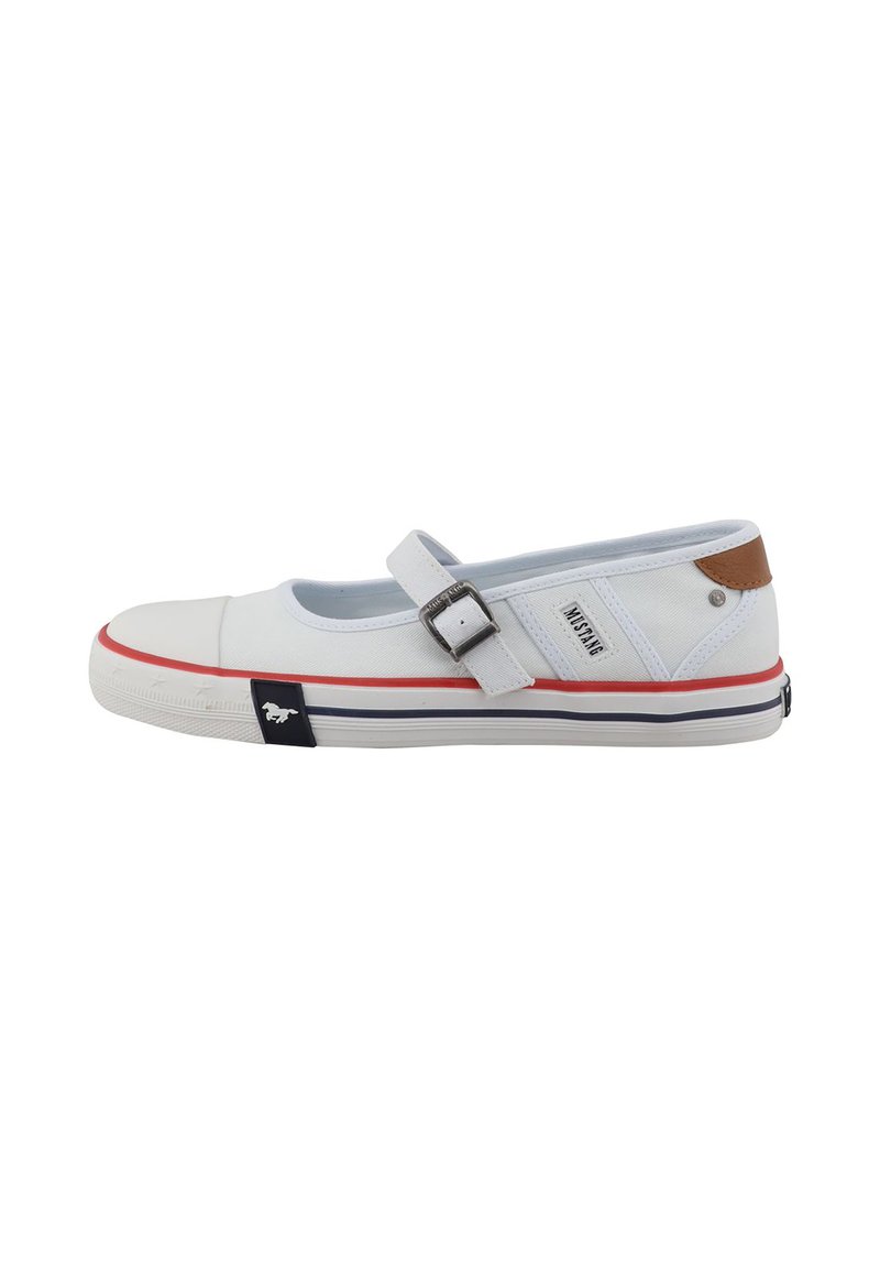 Chaussure blanche en toile avec une bride Mary Jane, des accents rouges et bleus marine sur la semelle, un détail en cuir marron au talon et une semelle extérieure en caoutchouc texturé.