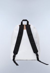 Femme aux cheveux bruns en queue de cheval portant une veste beige et un sac à dos blanc avec des bretelles noires et une poche avant, de dos sur un fond clair.