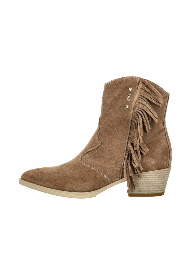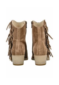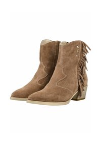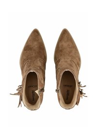 Bottine en daim marron avec talon empilé, détails de franges latérales et trois petites clous métalliques sur le côté extérieur.