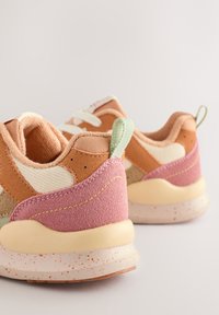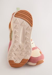 Baskets en mélange de daim et de mesh rose, beige et vert ; dotées d'une semelle mouchetée, d'un design superposé et d'accents contrastants.